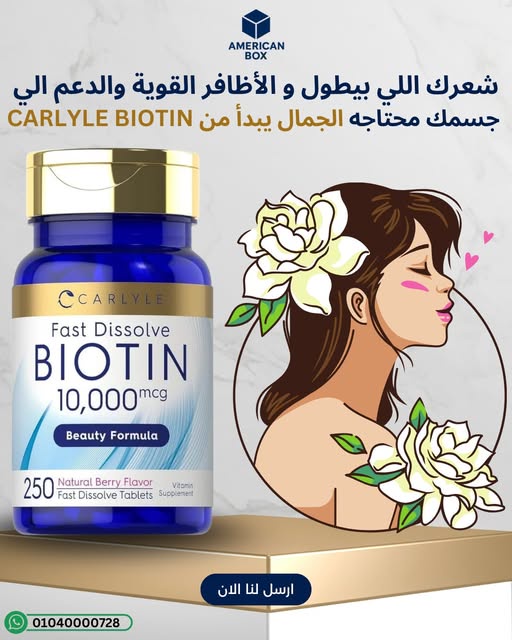 Carlyle Biotin 10,000mcg هو مكمل بيوتين بتركيز مرتفع في صورة أقراص سريعة الذوبان (Fast Dissolve) بطعم توت طبيعي، ومناسب لمن يريد دعم روتين الجمال اليومي (الشعر/البشرة/الأظافر) بطريقة سهلة بدون كبسولات. البيوتين هو فيتامين B7 ذائب في الماء ويُستخدم كثيرًا في مكملات “Beauty”.