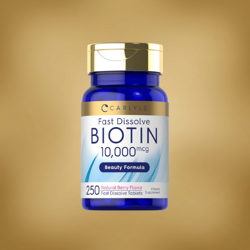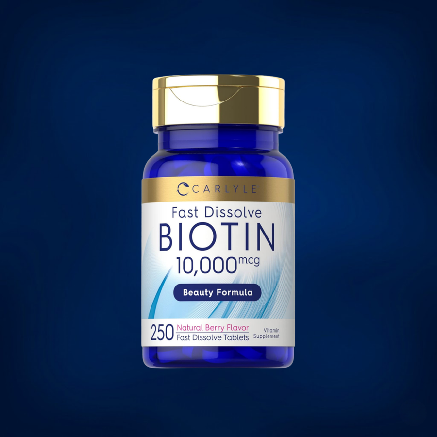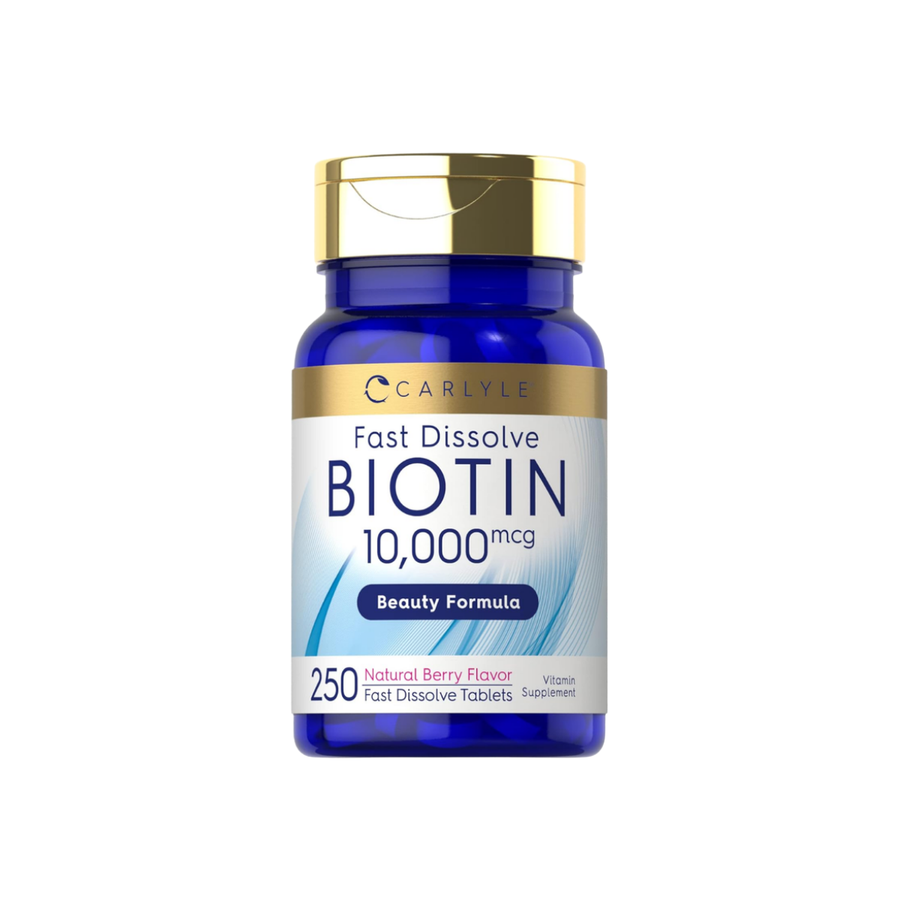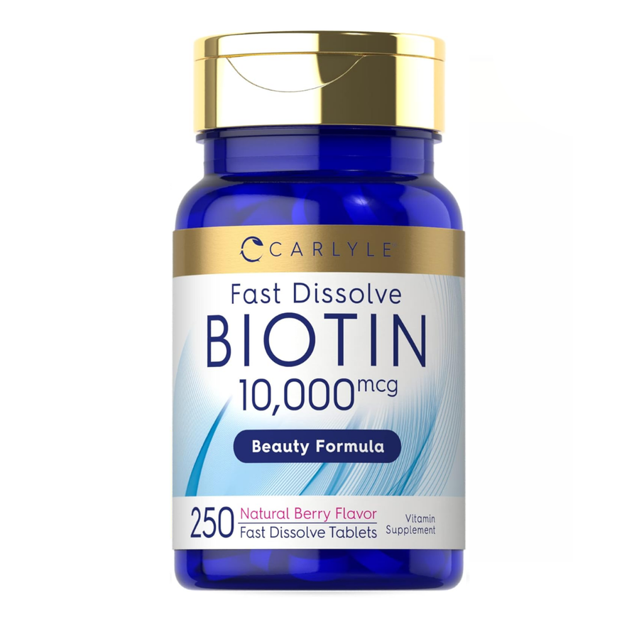 Carlyle Biotin 10,000 mcg is a high-strength biotin supplement in fast-dissolve tablets with a natural berry flavor, ideal if you want a simple capsule-free beauty routine (hair/skin/nails). Biotin is a water-soluble B vitamin (B7) commonly featured in beauty-support supplements.