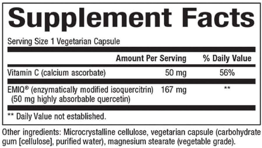 Commonly listed Supplement Facts show a serving size of 1 vegetarian capsule, providing 50 mg vitamin C plus 167 mg EMIQ®, noted as delivering 50 mg highly absorbable quercetin.