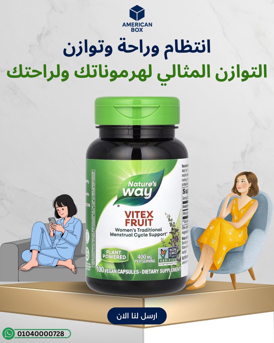 Nature’s Way Vitex Fruit 400mg (Chasteberry) لدعم توازن الدورة الشهرية | 1 كبسولة 2–3 مرات يوميًا ثم كبسولة يوميًا