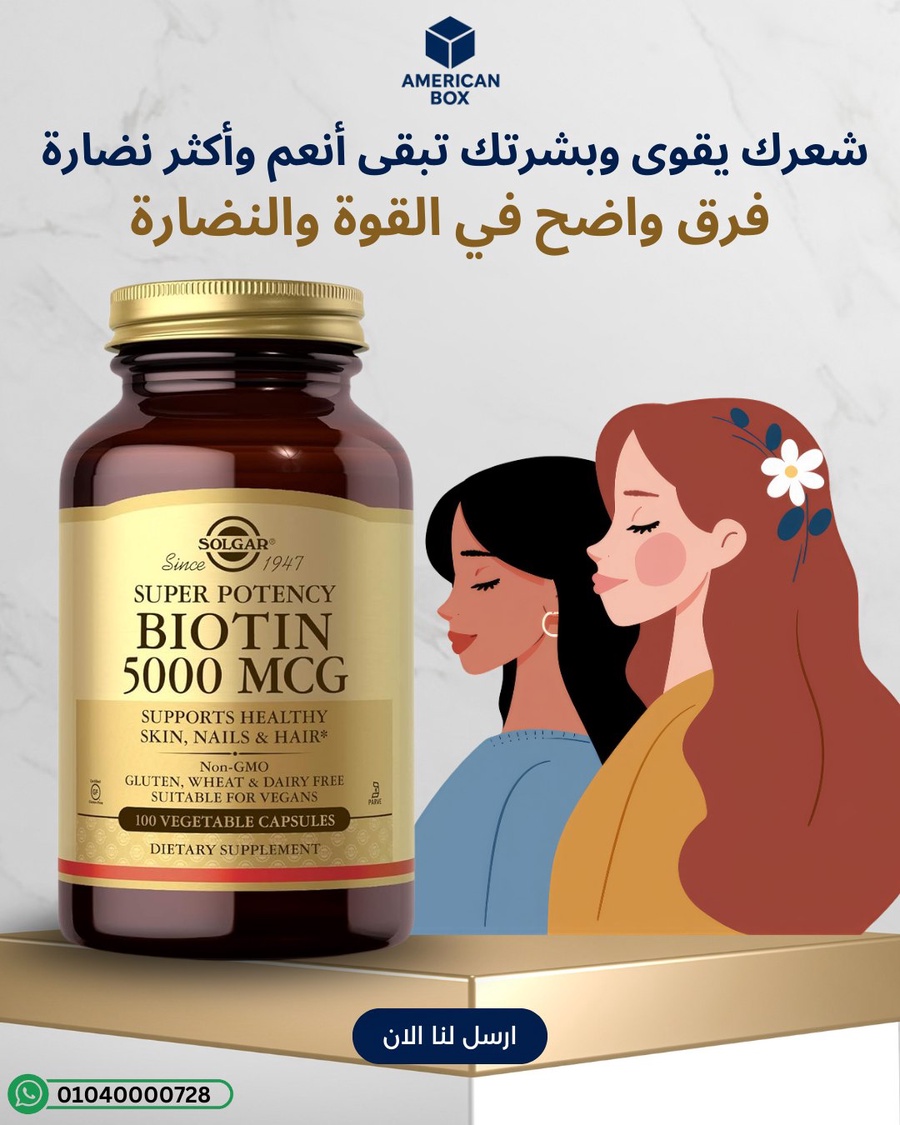 Solgar Biotin 5,000mcg هو مكمل بيوتين في كبسولات نباتية، ويُستخدم عادةً لدعم الشعر والبشرة والأظافر ضمن روتين الجمال اليومي. البيوتين (Vitamin B7) فيتامين ذائب في الماء، لذلك كثير من الناس يفضلون إضافته عندما يكون تناولهم الغذائي غير ثابت أو ضمن روتين “Beauty”.
