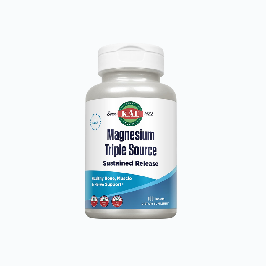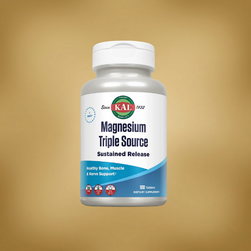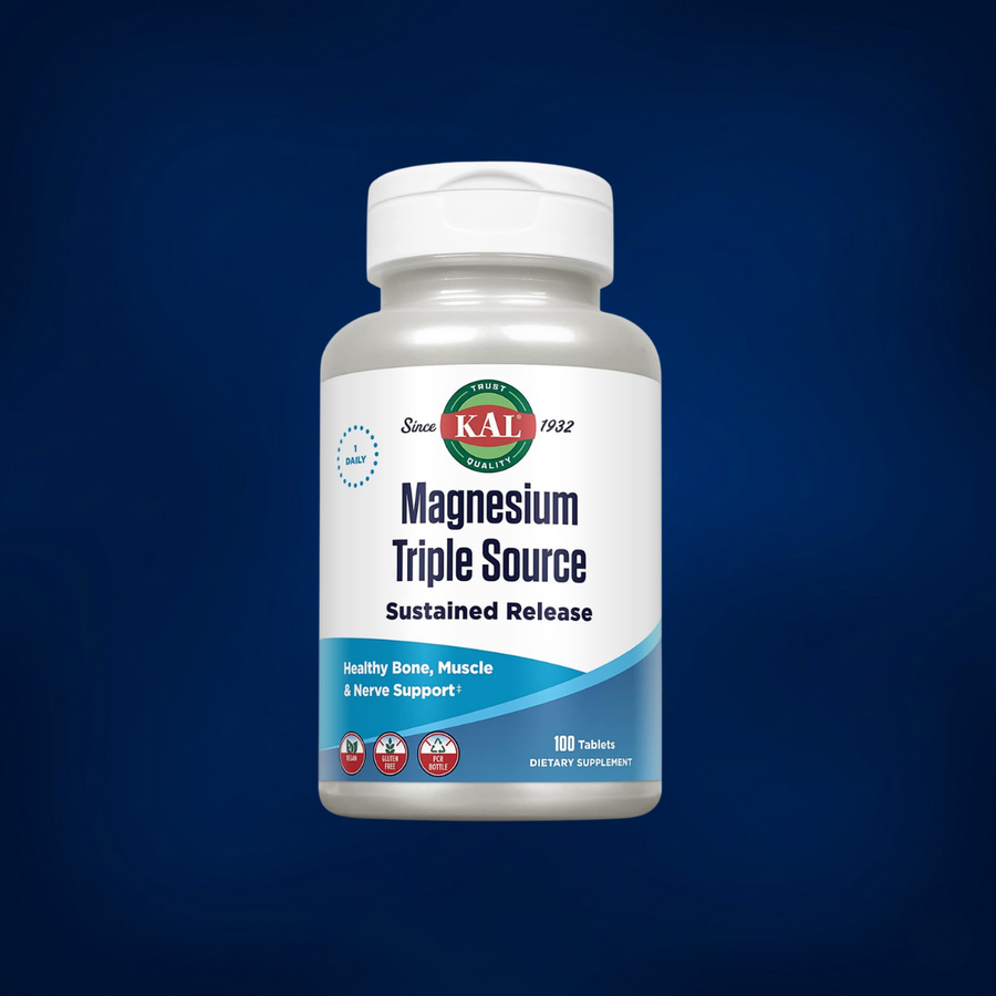 KAL Magnesium Triple Source delivers magnesium from 3 forms in one tablet (often in a sustained-release design) to support bones, muscles, nerves, and energy. Magnesium is an essential mineral involved in hundreds of biochemical reactions and is commonly used in relaxation and sleep routines.