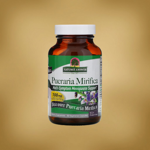 Pueraria mirifica هو نبات يحتوي على مركبات نباتية قد ترتبط بروتينات الجسم (Phytoestrogens)، لذلك يُستخدم غالبًا ضمن روتين دعم صحة المرأة خصوصًا خلال فترات التغيّر الهرموني. هذا المنتج من Nature’s Answer يأتي في كبسولات نباتية مع توجيه واضح للجرعة اليومية.