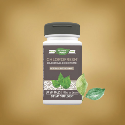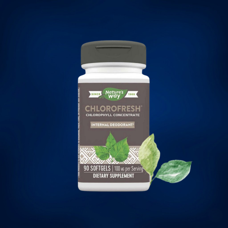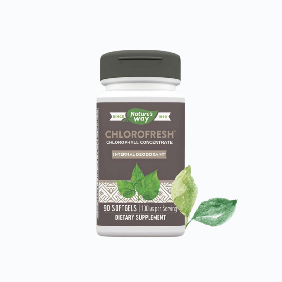 Chlorofresh (كبسولات/سوفتجل) من Nature’s Way هو مكمل يحتوي على كلوروفيلين (Chlorophyllin copper complex) ويُستخدم غالبًا لدعم الانتعاش الداخلي ورائحة النفس. شكل السوفتجل مناسب لمن يفضّلون الجرعات الدقيقة بدل السوائل