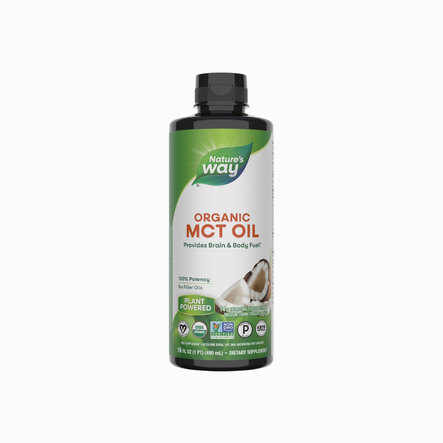 Nature’s Way Organic MCT Oil is a coconut-derived medium‑chain triglyceride oil commonly used for quick energy and as an easy add‑in to coffee and smoothies. It’s especially popular in low‑carb routines as a convenient, neutral-tasting fat source.