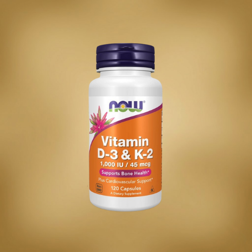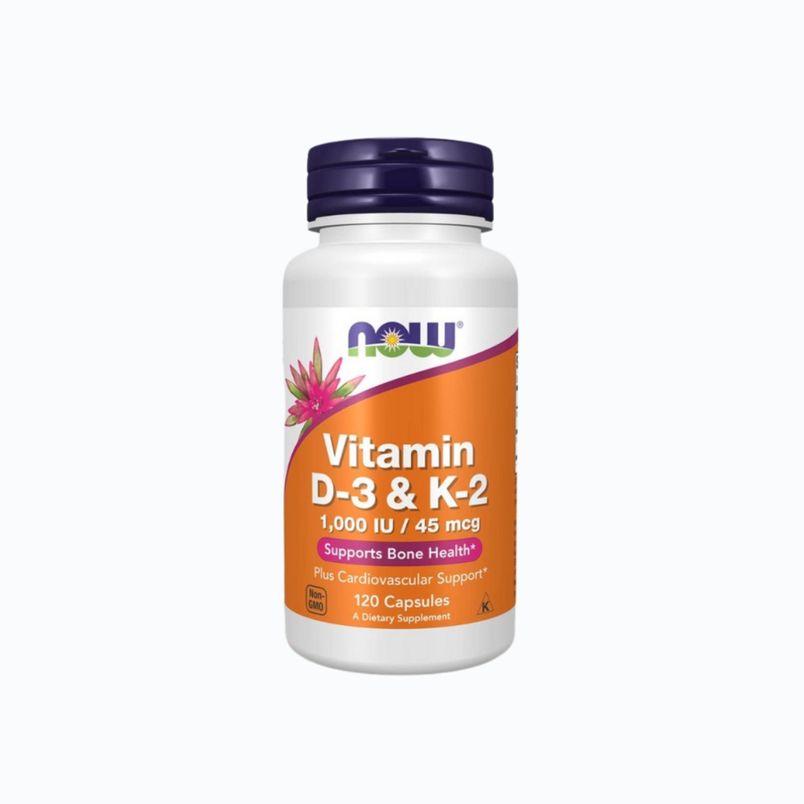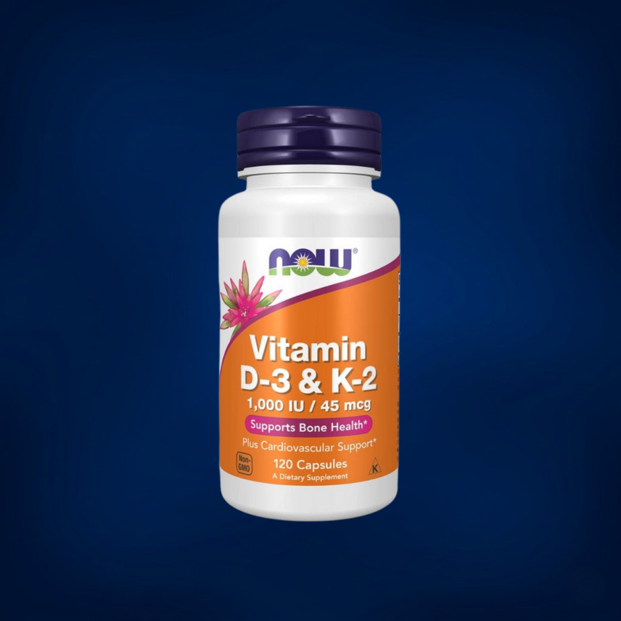 NOW D3+K2 1000IU/45mcg (120) لدعم العظام وامتصاص الكالسيوم | الجرعة: كبسولة 1 من 1–2 مرة يوميًا مع الطعام
