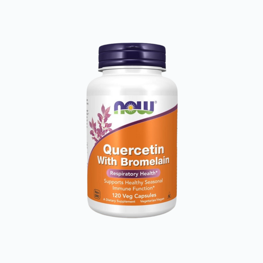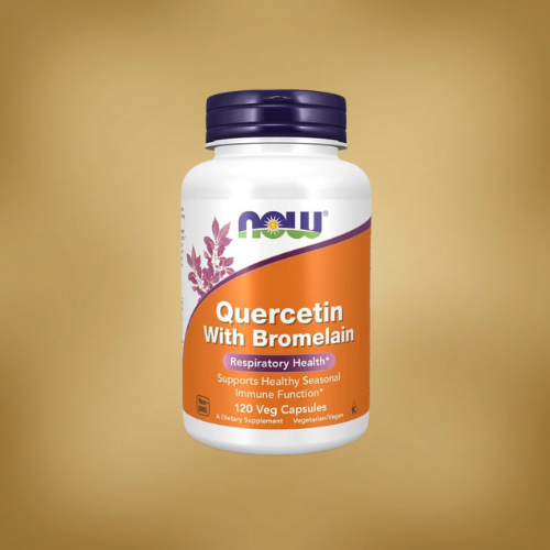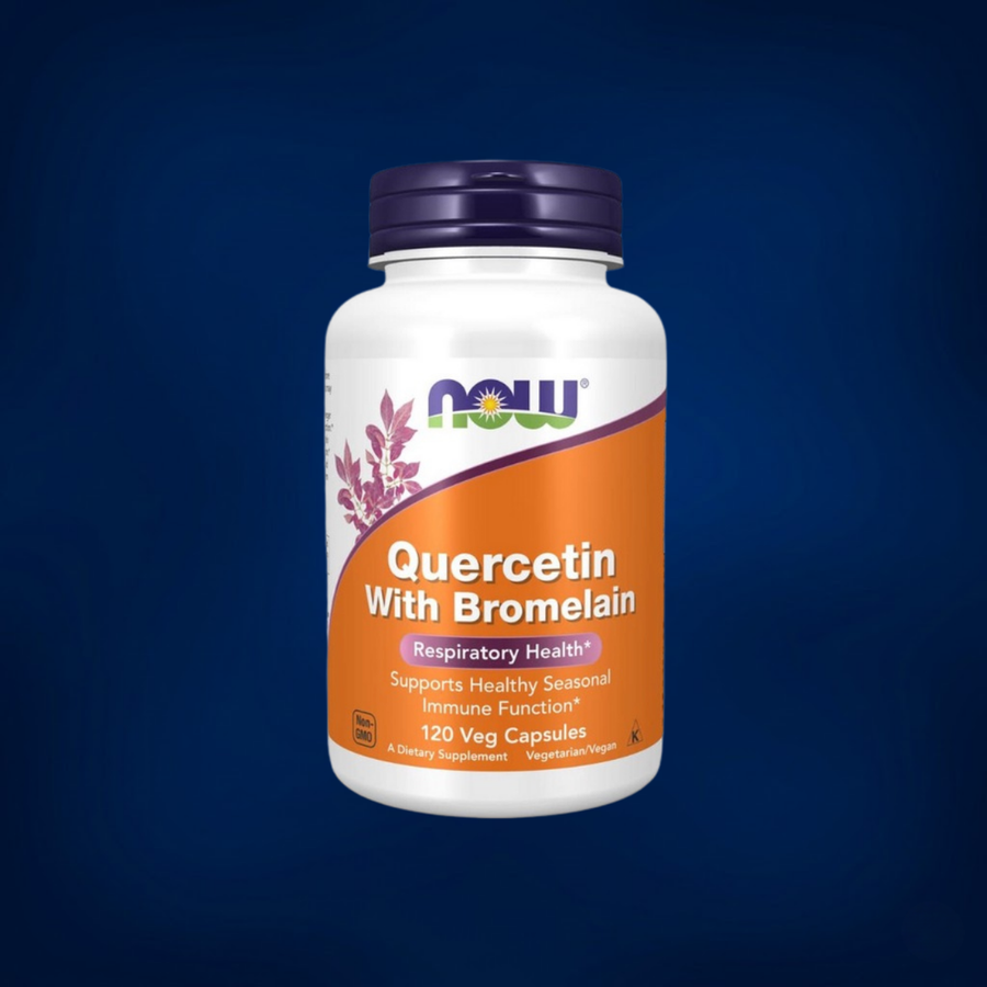 الكويرسيتين (Quercetin) هو فلافونويد نباتي يُستخدم كثيرًا ضمن روتين دعم المناعة والتعامل مع “عدم الارتياح الموسمي”. إضافة البروميلين (Bromelain) قد تساعد على دعم الامتصاص وبعض جوانب الاستجابة الالتهابية لدى بعض الأشخاص.