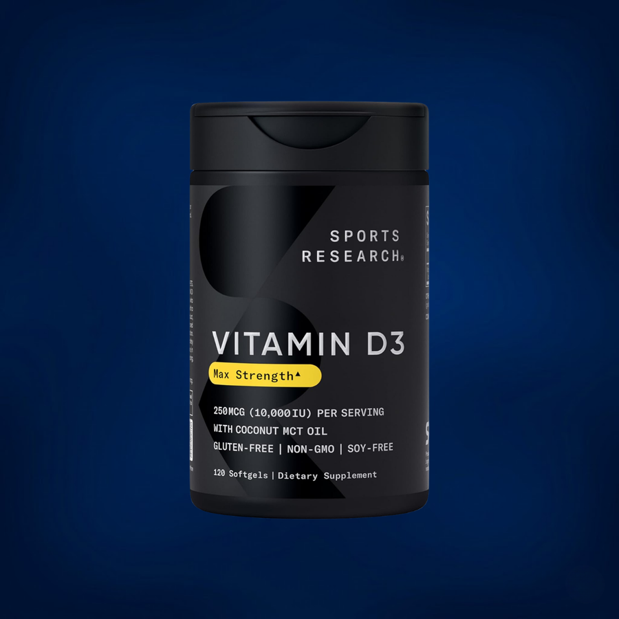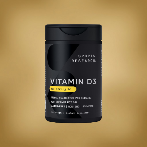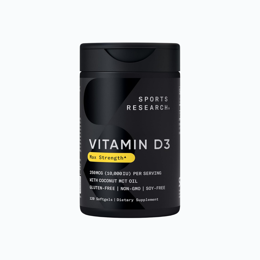 D3 is fat‑soluble, so taking it with a meal helps absorption. Many Sports Research softgels include MCT oil as the carrier for improved uptake.